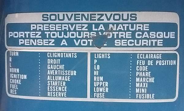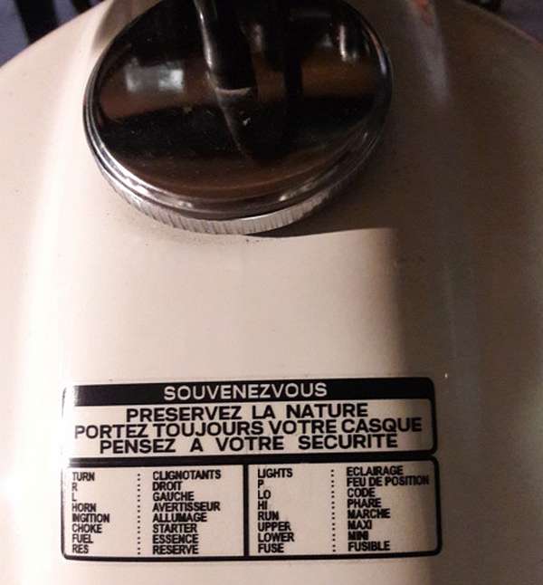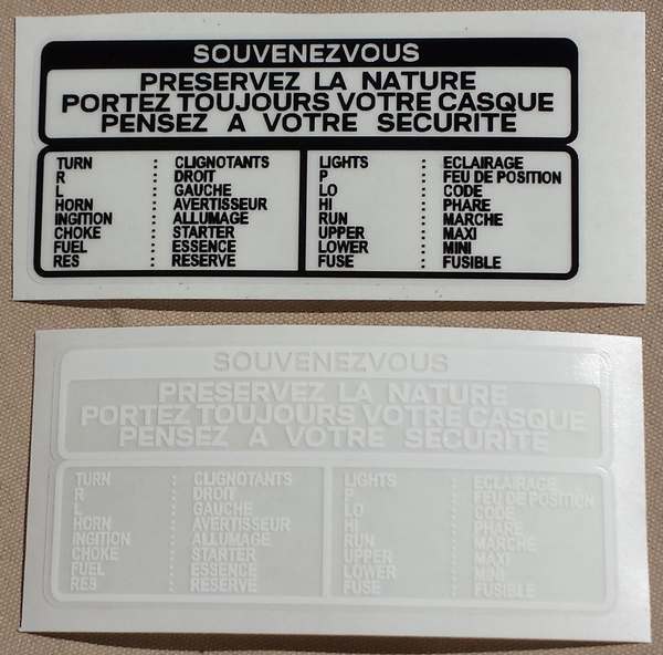 haut et juste en dessous un sticker 3 colonnes donnant la traduction en français des indications de la planche de bord et des comodos. Il y a eu 2 versions : texte en noir pour les réservoirs de teinte