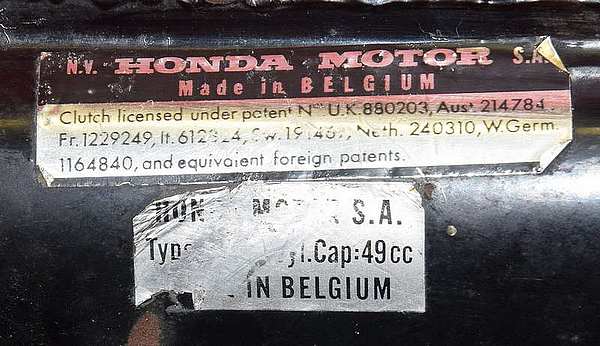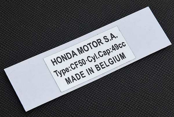 Sticker Honda CF50 Made in Belgium En 1963, Honda ouvre une usine en Belgique à Alost pour y produire essentiellement des cyclomoteurs et vélomoteurs 50cc destinés au marché Européen. Ceux qui étaient équipés d’une embrayage automatique comme celui du Super Cub recevaient un sticker spécial à l’enseigne de NV Honda Motor SA (Belgique) rappelant les brevets de cet embrayage, ainsi qu’un autre sticker propre au modèle produit. Curieusement, ces stickers n’ont pas de référence officielle chez Honda, il n’apparaissent pas dans les parts-list. Il étaient donc introuvables et nous les avons refabriqués à l’occasion de la restauration d’un CF50. Cette appelation CF50 reste un mystère car il s’agit de la version française du C320S / C321 bien connu en Belgique et aux Pays-Bas. Or l’appelation CF50 sera reprise quelques années plus tard pour le Chaly fabriqué au Japon ! Refabrication extrêmement soignée identique à l’origine sur support vinyle alu brossé, texte en noir. Le fond est brillant comme à l’origine, difficile à rendre en photo, j’en ai donc mis 2 avec des brillances différentes selon l’incidence de la lumière. La première photo est celle de ce qu’on trouve généralement sur des machines en relativement bon état ! La dernière est une copie du catalogue Honda France du CF50. prix unitaire : 10 € port inclus pour la France pour commander :